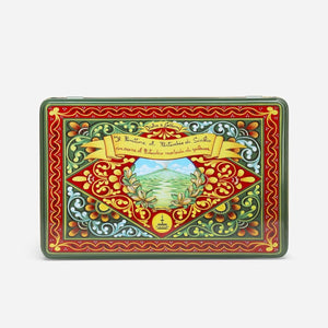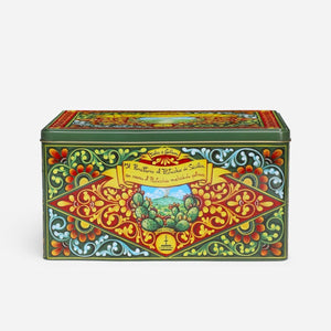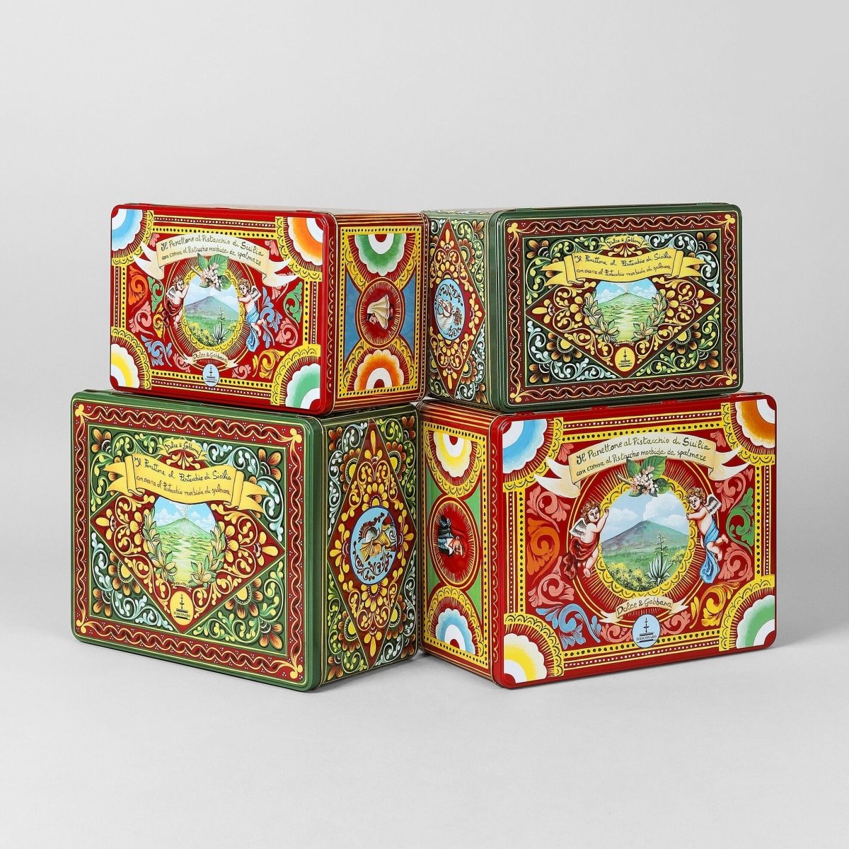 Il valore di questo panettone non è solo nel suo sapore. Viene presentato in una splendida latta da collezione disegnata da Dolce & Gabbana, con vivaci decorazioni ispirate ai motivi del carretto siciliano. Le latte, create da celebri artisti siciliani, trasformano questi contenitori in preziosi oggetti da collezionare e riutilizzare.